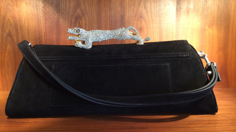 Custom-made black Patent leather handbag with 24" arm strap, complemented with our "Crocolion" handle. This Signature Handle is made of pewter, dipped in matte 24 Karat Gold with with 1,000 pave-style crystal rhinestones with eyes filled with Swarovski Aurora Borealis crystals. Our "special" Couture Untamed Coating has been applied to protect and preserve the finish.
